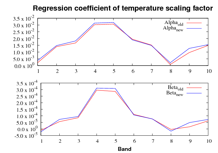 선형 상세 모델 (Line By Line)에 각 기체별 (H2O, CO2,)로 HITRAN 자료를 입력하여 계산되어진 temperature scaling factor(f)를 이용하여 다음과 같은 수식을 통해 온도보정 계수인 와 를 계산