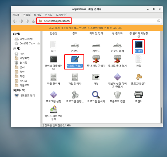 - 상단 주소에 "/usr/share/applications/" 기입하고 "터미널 & 텍스트 편집기"를 복사 후 바탕화면으로 붙여넣기를 합니다.