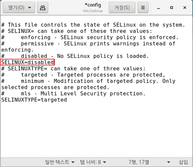 - 편집기에서 "SELINUX=disabled"으로 선택하고 저장합니다.