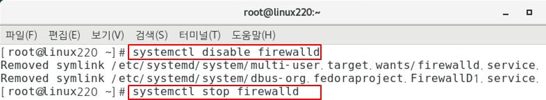 - 터미널에서 "systemctl disable firewalld" (부팅시 방화벽 해제) 및 "systemctl stop firewalld" (현재 방화벽 해제)를 입력합니다.