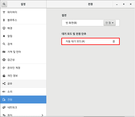 - 좌측 "전원" 메뉴에서 자동 대기 모드(A)를 "끔"으로 선택합니다.