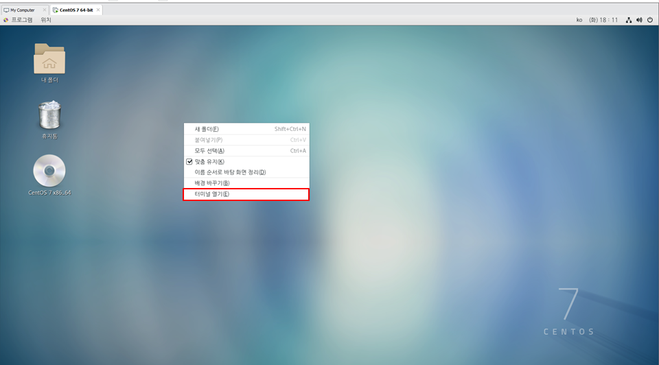 - 마우스 우측 버튼에서 "터미널 열기(E)"를 선택합니다.