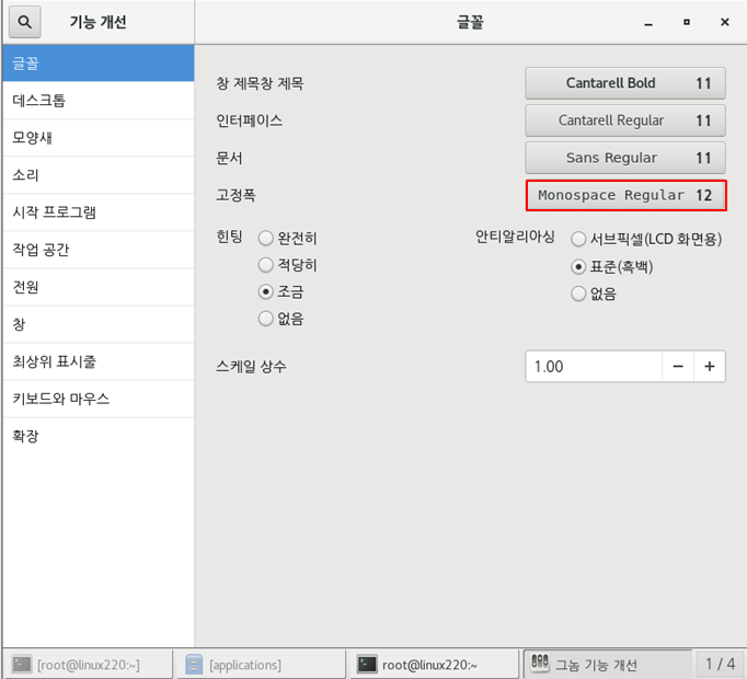 - 좌측 "글꼴" 메뉴에서 고정폭으로 "폰트 및 크기"를 설정합니다.