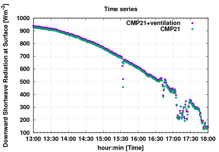 그림. 일사량 관측 자료를 이용한 환풍 유무에 따른 시계열. -