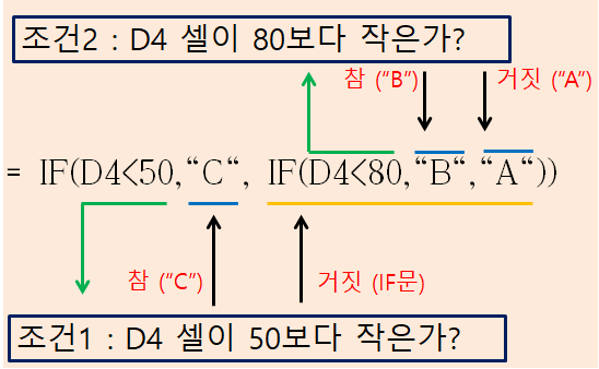 첫 번째 IF 함수에서 조건을 충족하지 못하는 경우 다음 IF 함수에서 조건에 따라 처리하도록 작성된다.