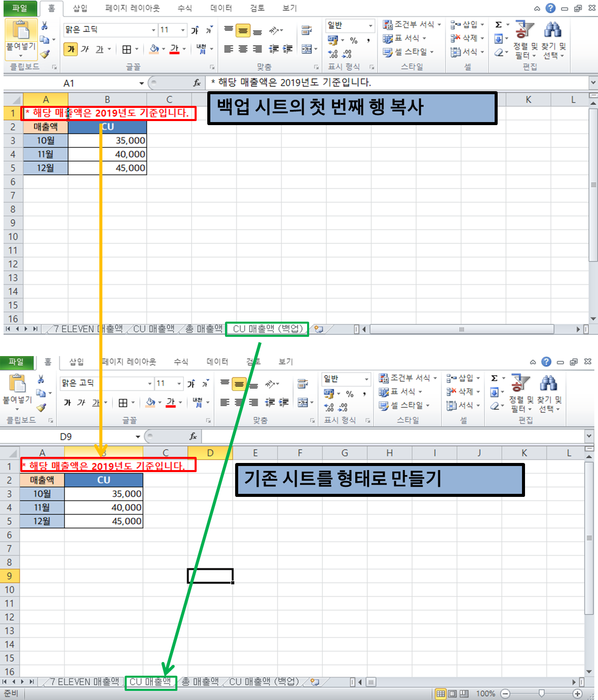 백업 한 시트로부터 "CU 매출액 (백업)" 다시 1 행을 복사 한 후 원래 시트 "CU 매출액" 의 1행에 다시 붙여넣는다.