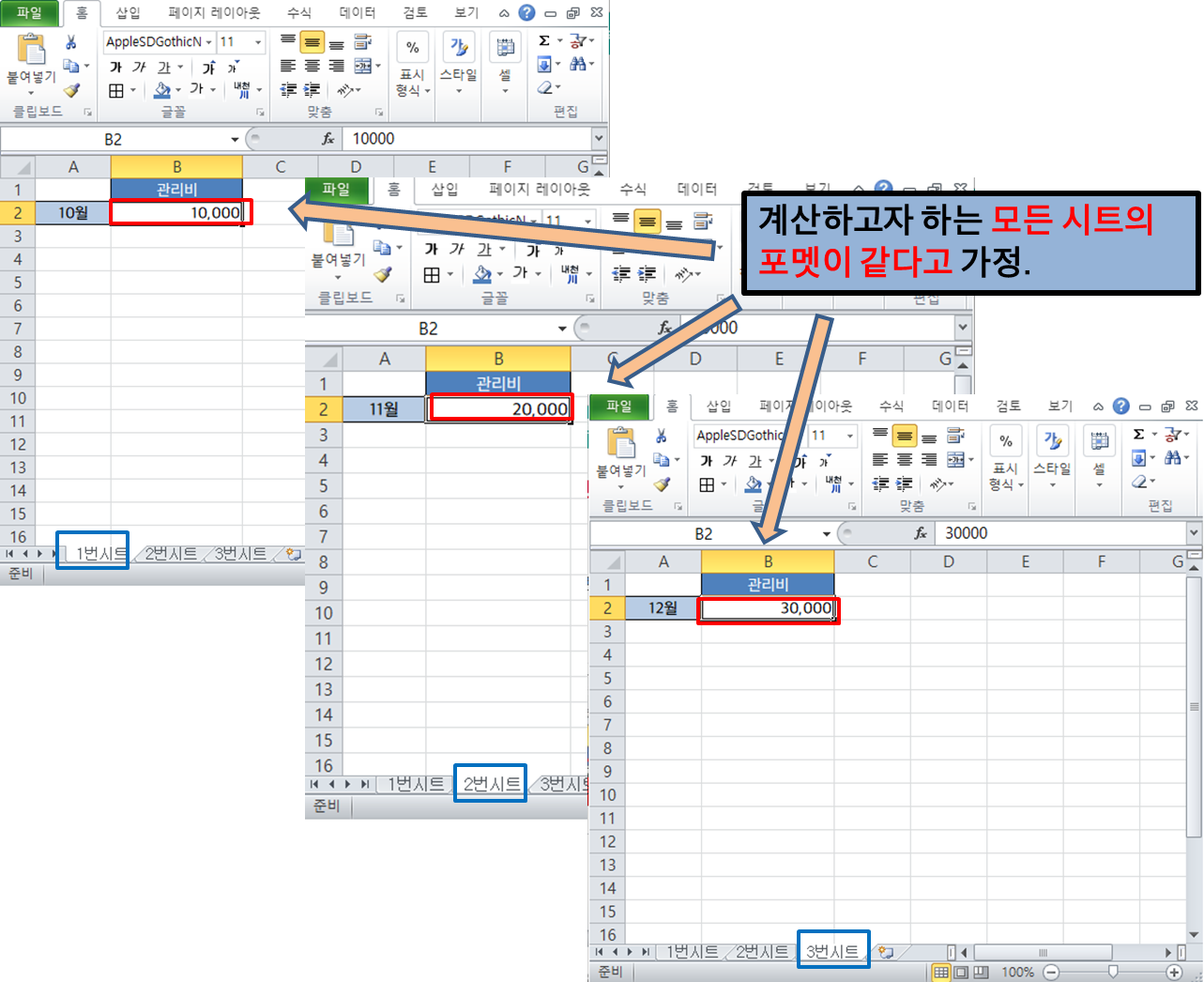 이 경우 동일한 시트에서 합계를 구하는 것은 간단한 작업이다. 그러나 다중 시트에 대한 합계는 복잡한 절차를 요구한다.
