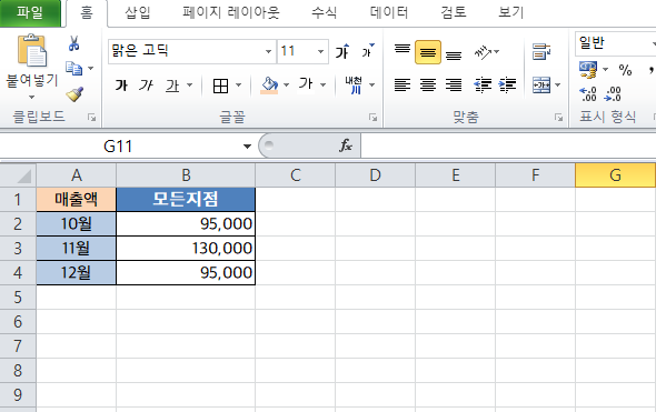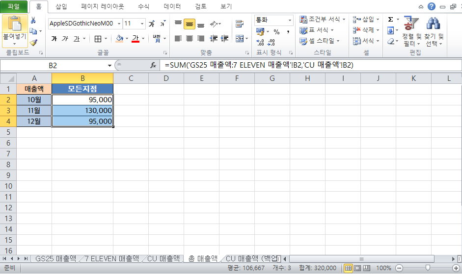 위의 작업을 순서대로 진행하면 "총 매출액" 시트에 모든 지점의 합이 계산된다.