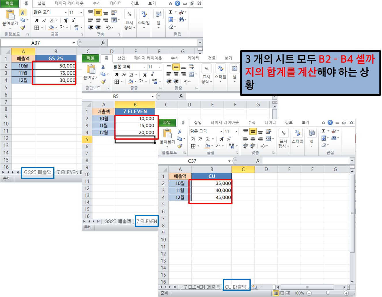 = SUM (GS25매출액 : 7 ELEVEN 매출액!' B2, CU 매출액!' B3 )