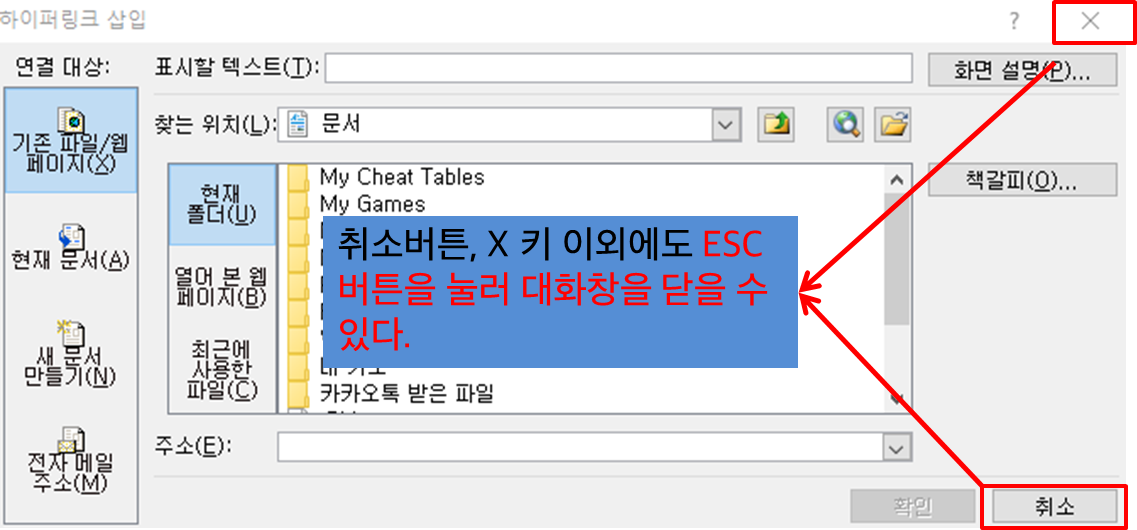 대화창에는「취소」버튼 또는 오른쪽 상단의 "X"버튼이 존재하긴 하지만 "ESC" 키를 눌러 대화창을 닫는것이 더욱 빠르다.