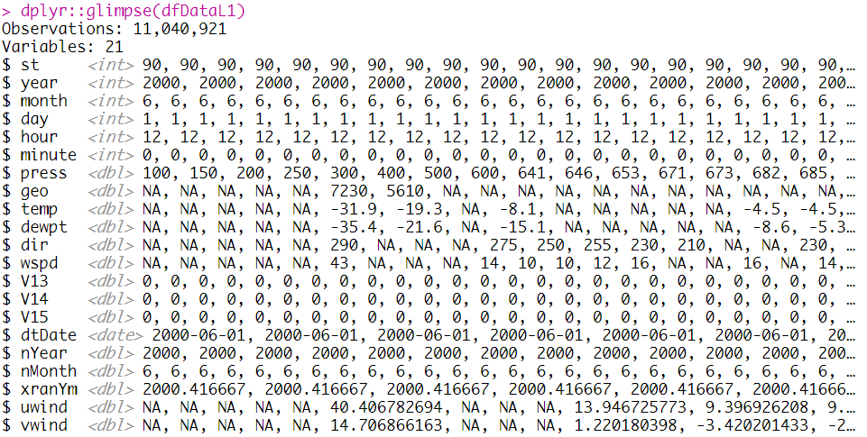 colnames(dfData) = c("st", "year", "month", "day", "hour", "minute", "press", "geo", "temp", "dewpt", "dir", "wspd", NA, NA, NA)