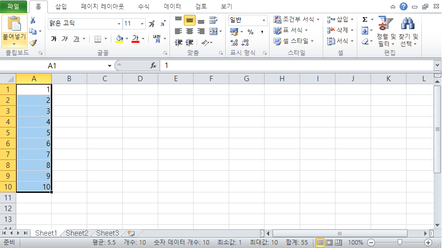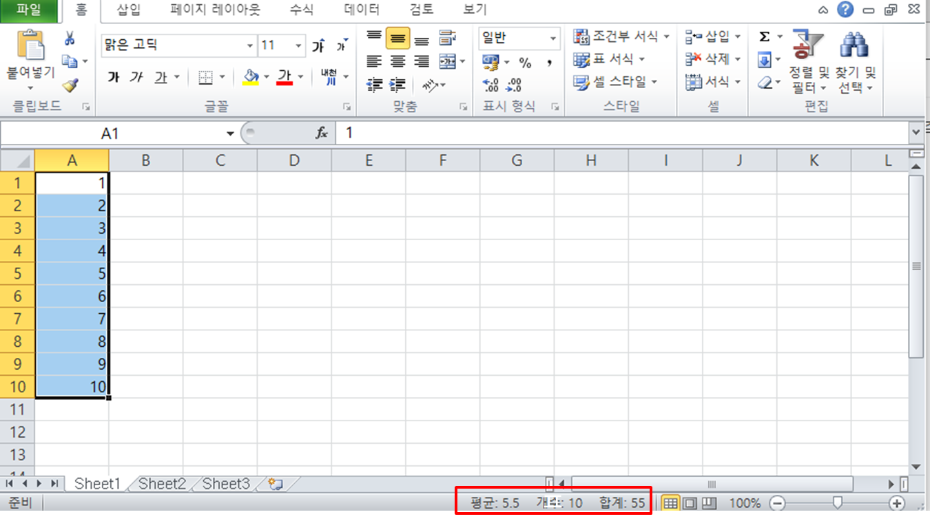 위의 에시는 1 ~ 10까지를 선택하고, 그 집계 결과 (평균, 개수, 합계)가 적색 사각형 부분에 표시된 것이다.
