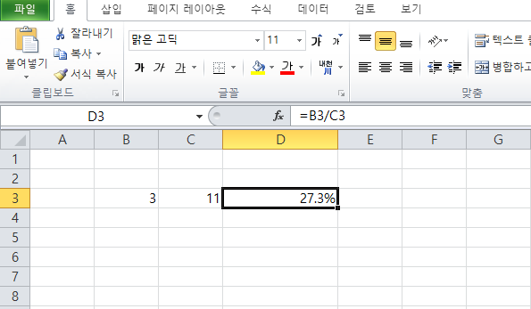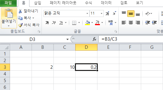 B3 셀을 C3 셀로 나눈 값을 표시하기 위해 D3 셀에 다음 나눗셈 식을 입력한다.