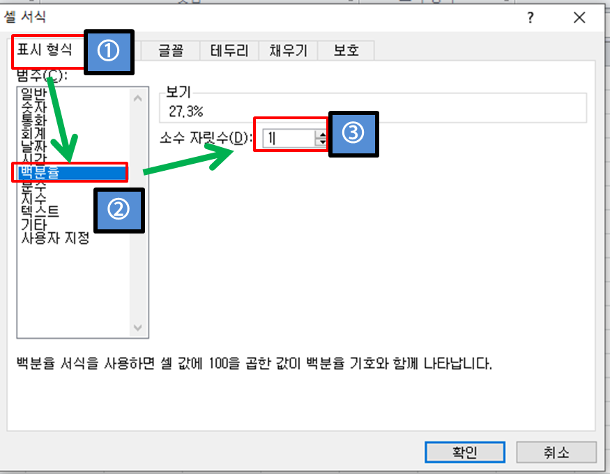 그런 다음 "표시형식"탭 (①) → "백분율"(②) → "소수 자릿수" 에 "1"을 입력한다. (③)