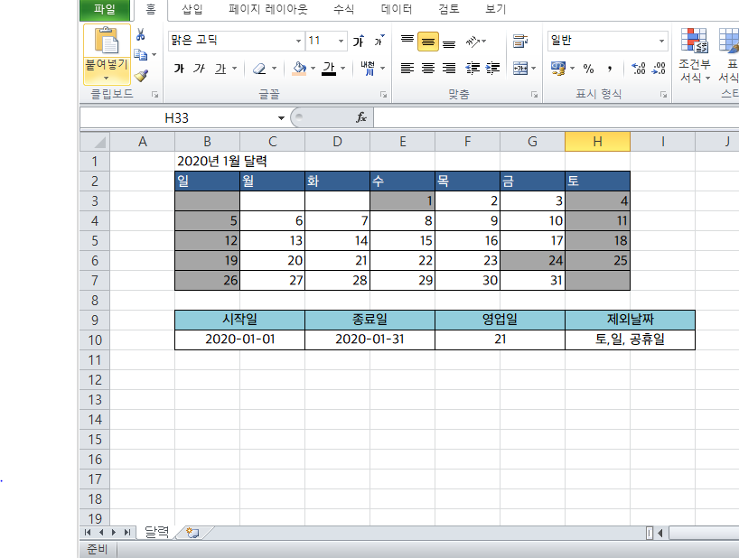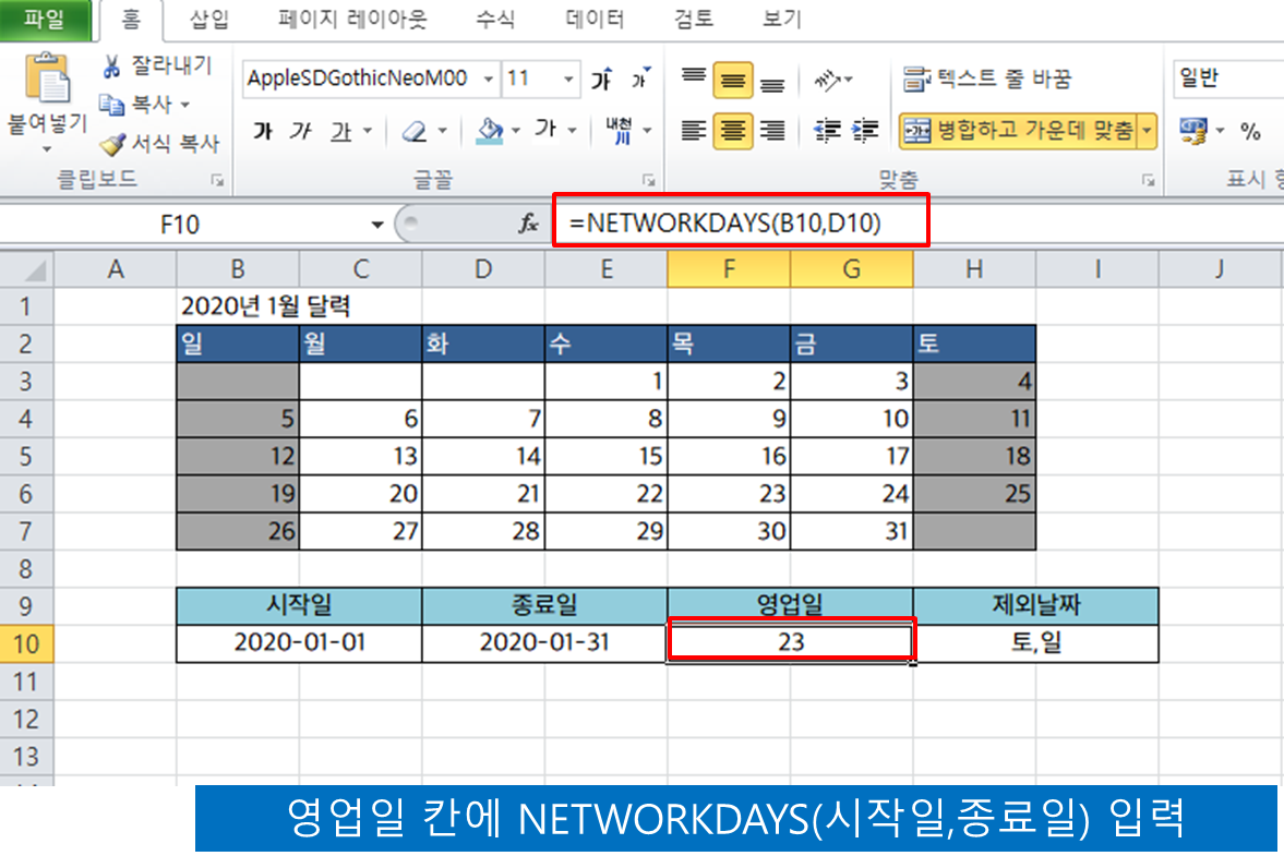 - 위의 달력에서 직접 확인하면 2020 년 1 월 회색영역 (주말) 제외한 일수가 23일 이고, NETWORKDAYS 함수도 같은 23 일을 표시하는 것을 확인할 수 있다.