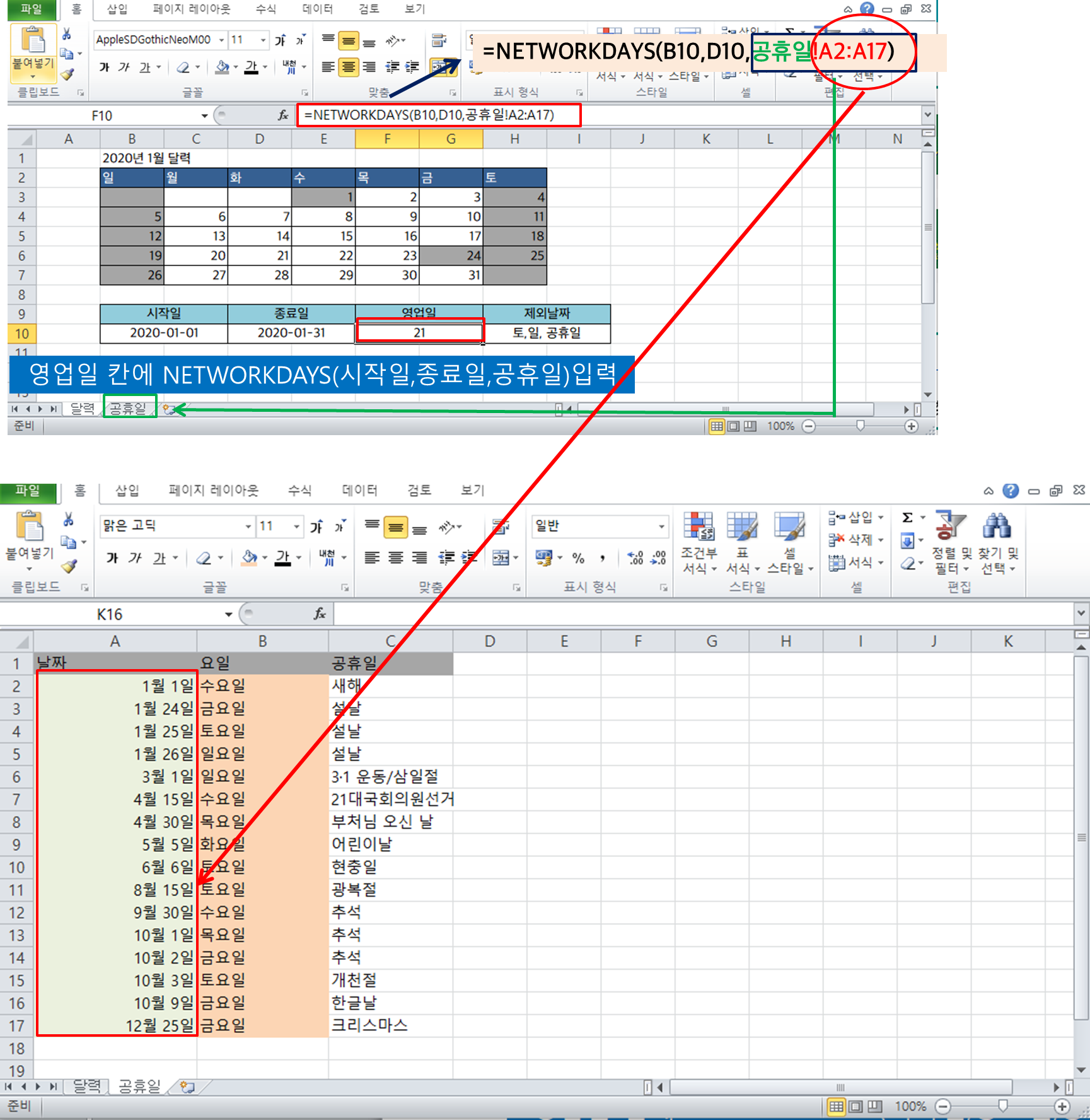 - 위의 예시에서는 공휴일 시트의 A2:A17 까지의 영역을 참조하여 추가적으로 공휴일을 지정하고 있다. (위의 설명 이미지 참조)