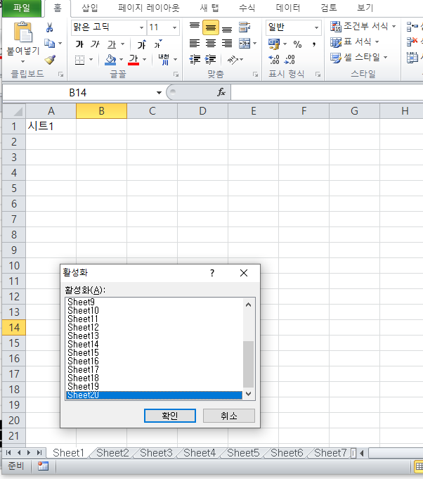 이렇게 할 경우 시트 선택 대화상자가 나오는데 여기서 원하는 시트를 클릭하면 된다.