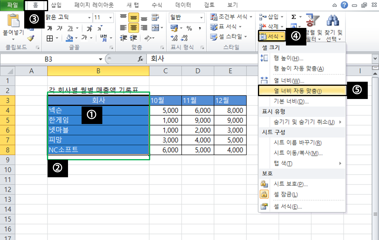 그리고 리본 탭 "홈"을 클릭 (③) "서식"(④)을 클릭하여 "열 너비 자동 맞춤"을 선택 한다. (⑤)