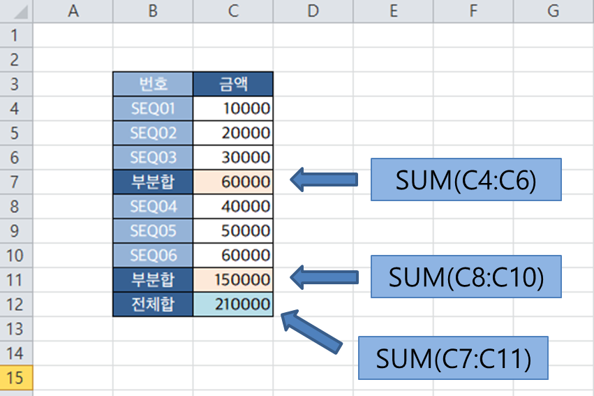 또한 총 합을 나타내는 SUM 함수는 C12 에서 부분합 C7, C11 만 지정하고 있다.