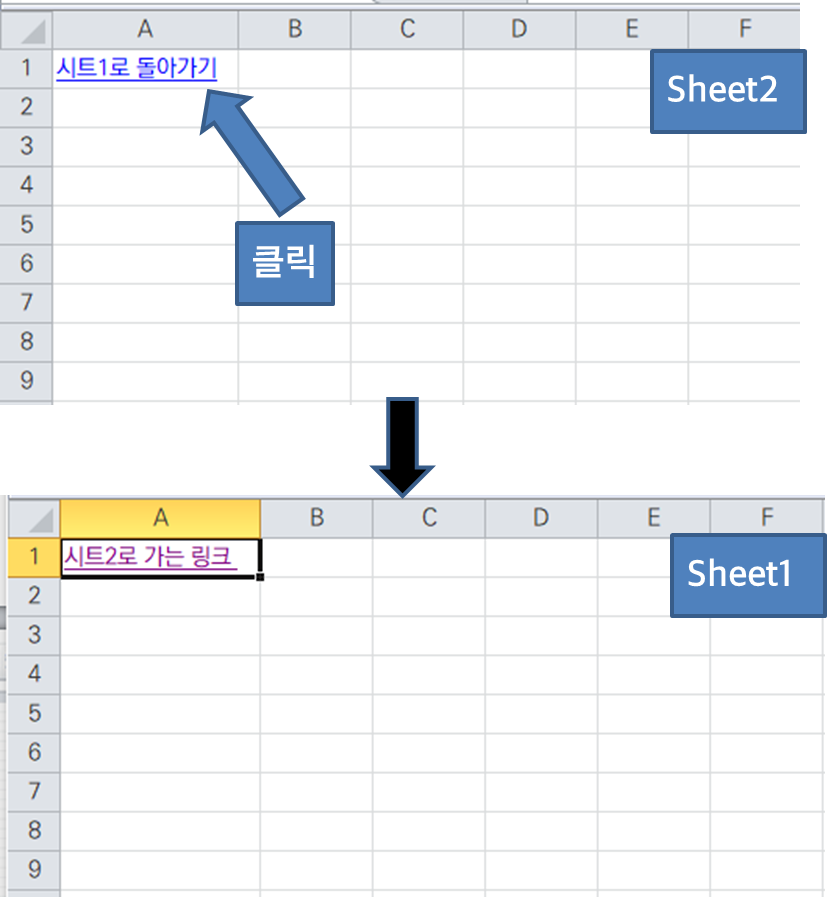 또한 "Sheet2" 에서 다시 "Sheet1" 로 돌아가는 링크를 만들 수 있다.
