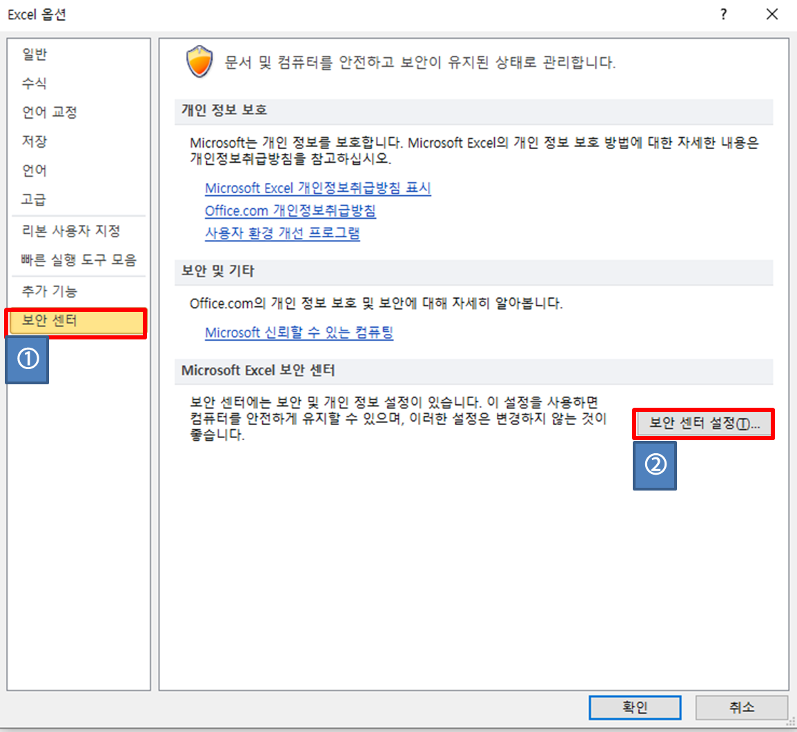 매크로가 있는 엑셀에서 경고를 나오지 않게 하기 위해서는 옵션에서 변경한다.
