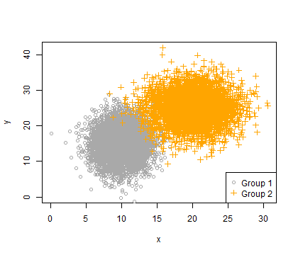 legend("bottomright", legend = c("Group 1", "Group 2"), pch = c(1, 3), col = c("darkgrey", "orange"))