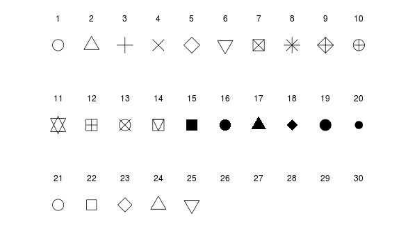 for (i in 1:10) points(i, 1, cex = 3, pch = i+20)