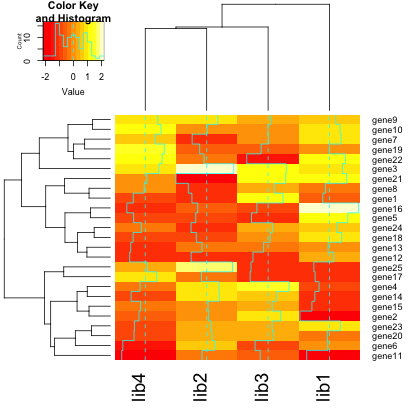 히트맵 이외에 밀도 데이터와 스케일 바 등의 부가 정보도 그려야 하는 경우 gplots 패키지의 heatmap.2 기능을 사용할 수 있다.
