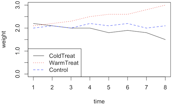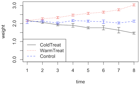 아래의 코드는 ColdTreat, WarmTreat, Control의 3 군 각각 3 개의 복제 실험이 행해졌다고 가정하고, 선 및 오류 막대를 그리는 방법을 보여준다.