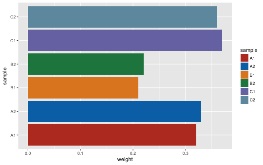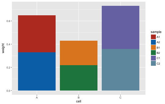 g <- ggplot(x, aes(x = cell, y = weight, fill = sample))