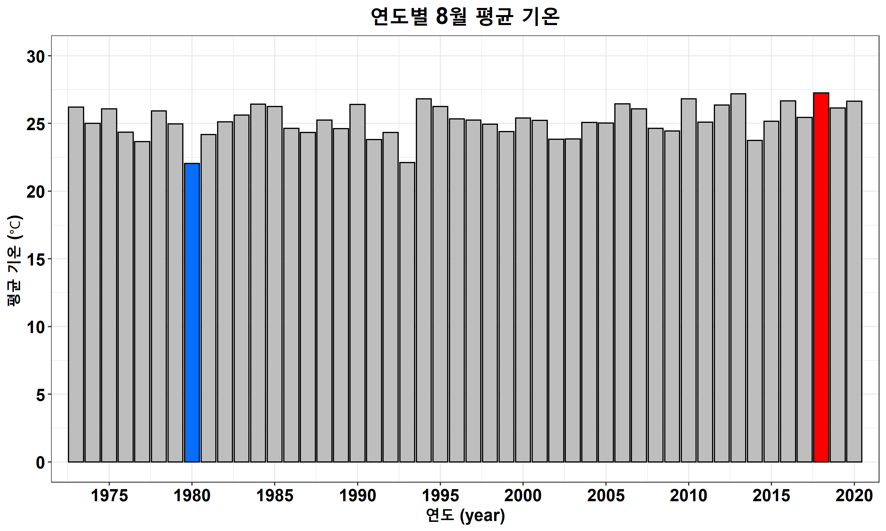 기상청에서 전국 1973년부터 2020 년까지 연속해서 관측자료가 있는 60개 지점의 기상관측자료를 분석한 결과 2020년 8월 평균기온은 26.6℃ 로 평년(25.2℃)보다 1.4℃ 높아 8월 평균기온 역대순위 6위를 기록하였다.