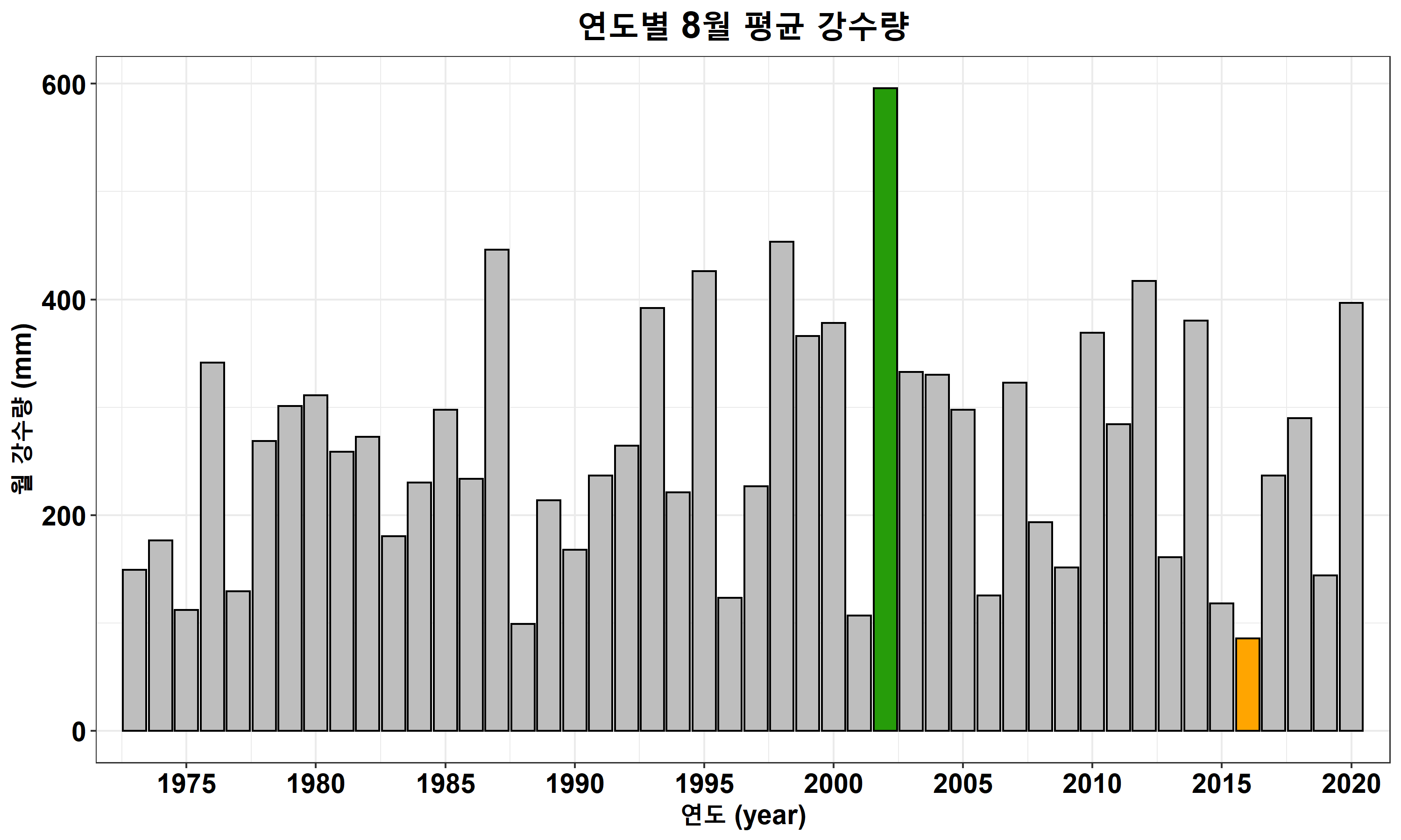 1973년부터 2020년까지 전국 60개 관측지점의 연강수량을 분석한 결과 2020년 8월 전국평균 강수량이 369.9mm로 평년(262.85mm)대비 151% 수준으로 8월 강수량 역대순위 6위를 기록하였다.