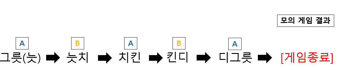 최종적인 승리자는 A 플레이어이며, 게임 플레이 도중 양측 플레이어가 사용한 모든 단어는 5개 입니다.